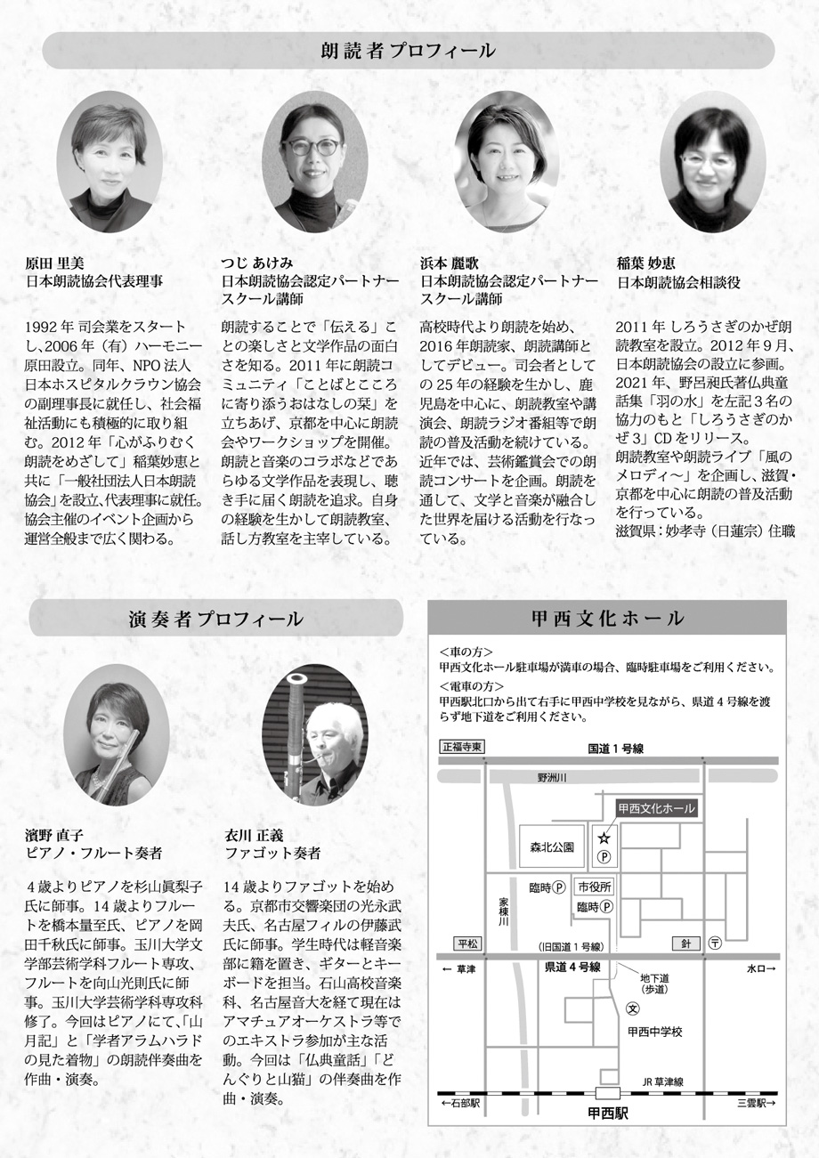朗読内容 : お一人10~15分(聴き手1名同伴)